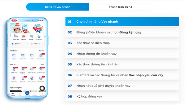 Các bước đăng ký: Đăng nhập VNPAY → Tìm tính năng Vay Nhanh → Xác thực thông tin và CCCD → Nhập OTP ký hợp đồng → Nhận kết quả phê duyệt.