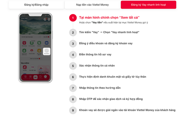 Các bước đăng ký: Đăng nhập Viettel Money → Tìm Vay nhanh linh hoạt → Điền thông tin và xác thực CCCD → Nhập OTP ký hợp đồng → Nhận giải ngân vào tài khoản.