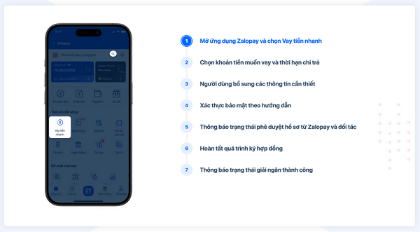 Các bước đăng ký: Mở Zalopay → Chọn Vay tiền nhanh → Chọn số tiền và kỳ hạn → Xác thực bảo mật → Ký hợp đồng và nhận thông báo giải ngân.